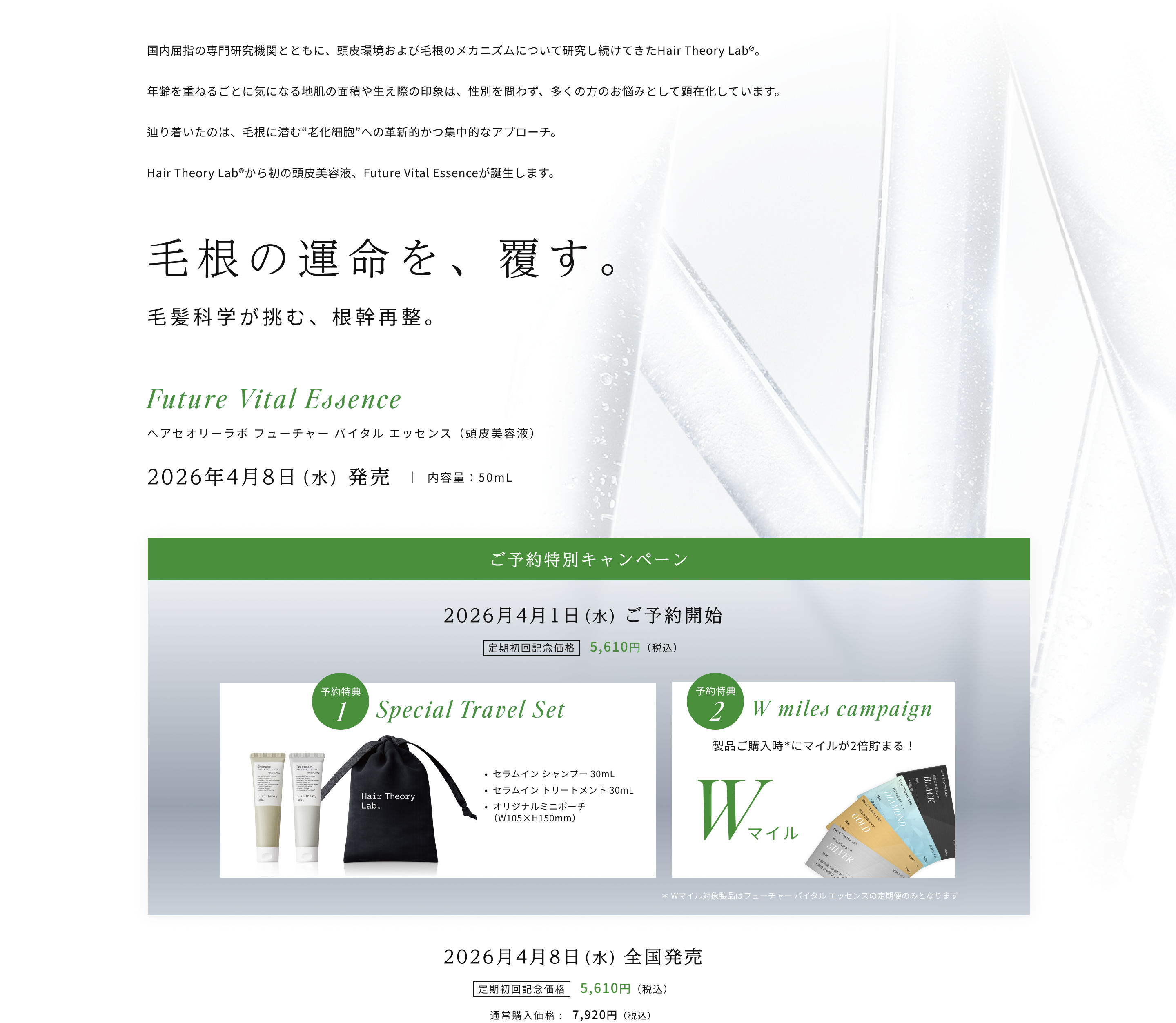 美しい髪を育む旅を、Hair Theory Lab®と楽しんでいただくマイレージプログラム。マイルを貯めて、限定ギフトアイテムとの交換や特別なイベントへのご招待など様々な特典をご体験いただけます。