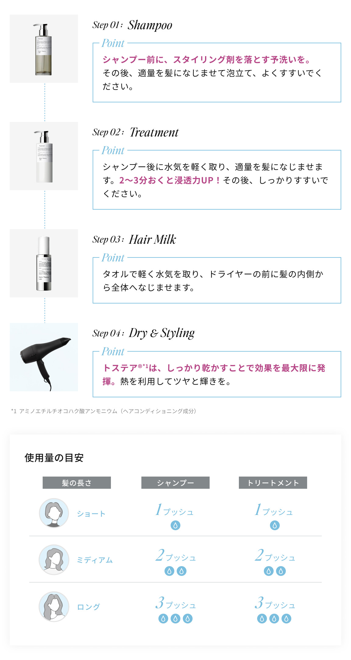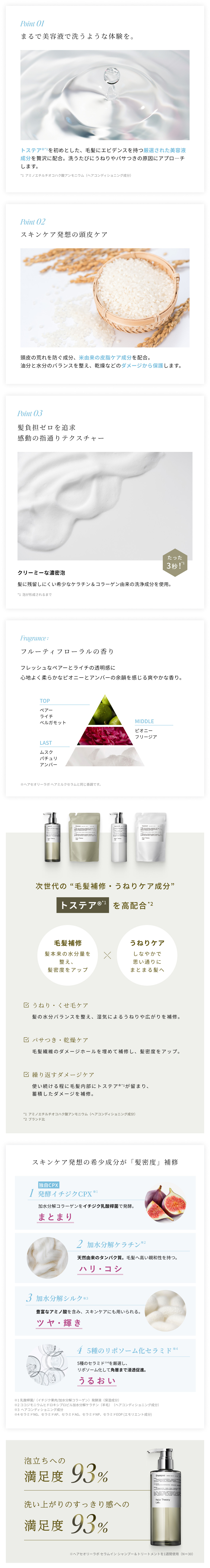 水、オレフィン(C14-16)スルホン酸Na、コカミドプロピルベタイン、ココアンホ酢酸Na、ラウラミドDEA、ラウレス-4カルボン酸Na、PPG-9ジグリセリル、アラニン、グリシン、BG、乳酸桿菌/(イチジク果肉/加水分解コラーゲン)発酵液、アミノエチルチオコハク酸ジアンモニウム、ココジモニウムヒドロキシプロピル加水分解ケラチン(羊毛)、加水分解シルク、ポリクオタニウム-10、グリチルリチン酸2K、フィトステロールズ、セラミドNG、セラミドAP、セラミドAG、セラミドNP、セラミドEOP、塩化Na、ラウリン酸BG、コカミドメチルMEA、ココイル加水分解コラーゲンK、スルホコハク酸(C12-14)アルケス-3-2Na、ココイル加水分解ケラチンK(羊毛)、ポリソルベート20、ヤシ油脂肪酸PEG-7グリセリル、水添レシチン、DPG、クエン酸、クエン酸Na、EDTA-2Na、フィチン酸、フェノキシエタノール、安息香酸Na、香料