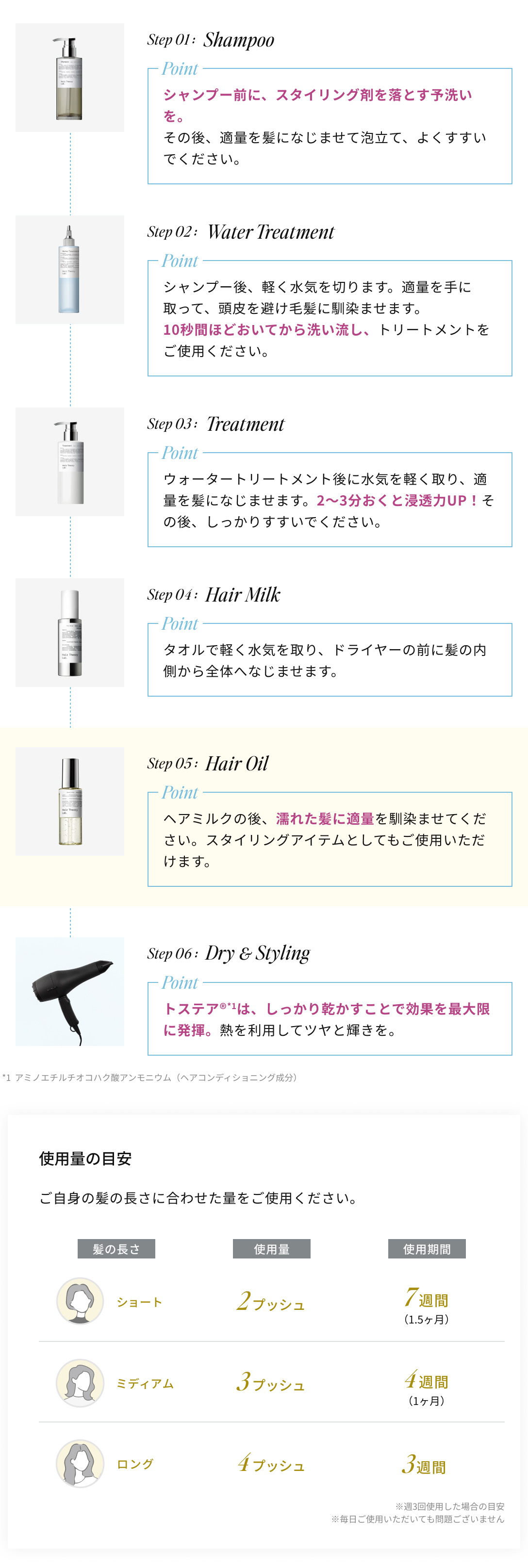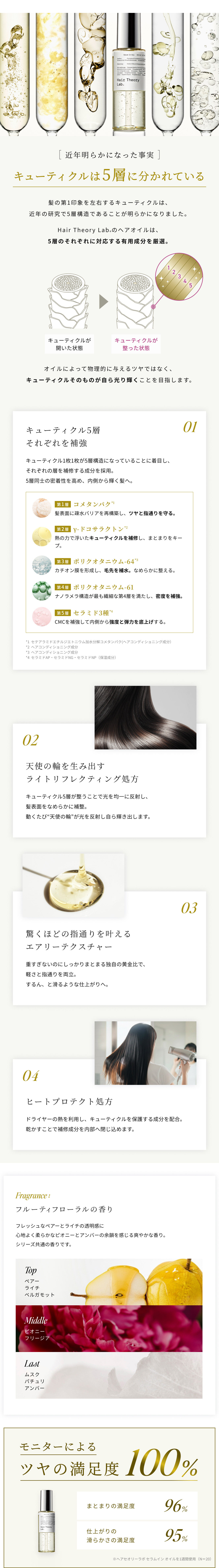 シクロペンタシロキサン、ジメチコン、パルミチン酸エチルヘキシル、フェニルトリメチコン、安息香酸アルキル(C12-15)、ジラウロイルグルタミン酸リシンNa、グリセリン、アミノエチルチオコハク酸ジアンモニウム、ポリクオタニウム-61、ポリクオタニウム-64、γ-ドコサラクトン、アモジメチコン、セテアラミドエチルジエトニウム加水分解コメタンパク、シクロヘキサン-1,4-ジカルボン酸ビスエトキシジグリコール、テトラエチルヘキサン酸ペンタエリスリチル、ラウロイルグルタミン酸ジ(フィトステリル/オクチルドデシル)、リンゴ酸ジイソステアリル、セバシン酸ジエチル、セラミドAP、セラミドNG、セラミドNP、ジメチコノール、水、コレステロール、メドウフォーム-δ-ラクトン、クオタニウム-18、クオタニウム-33、メトキシケイヒ酸エチルヘキシル、BG、PG、酢酸トコフェロール、トコフェロール、レブリン酸、香料