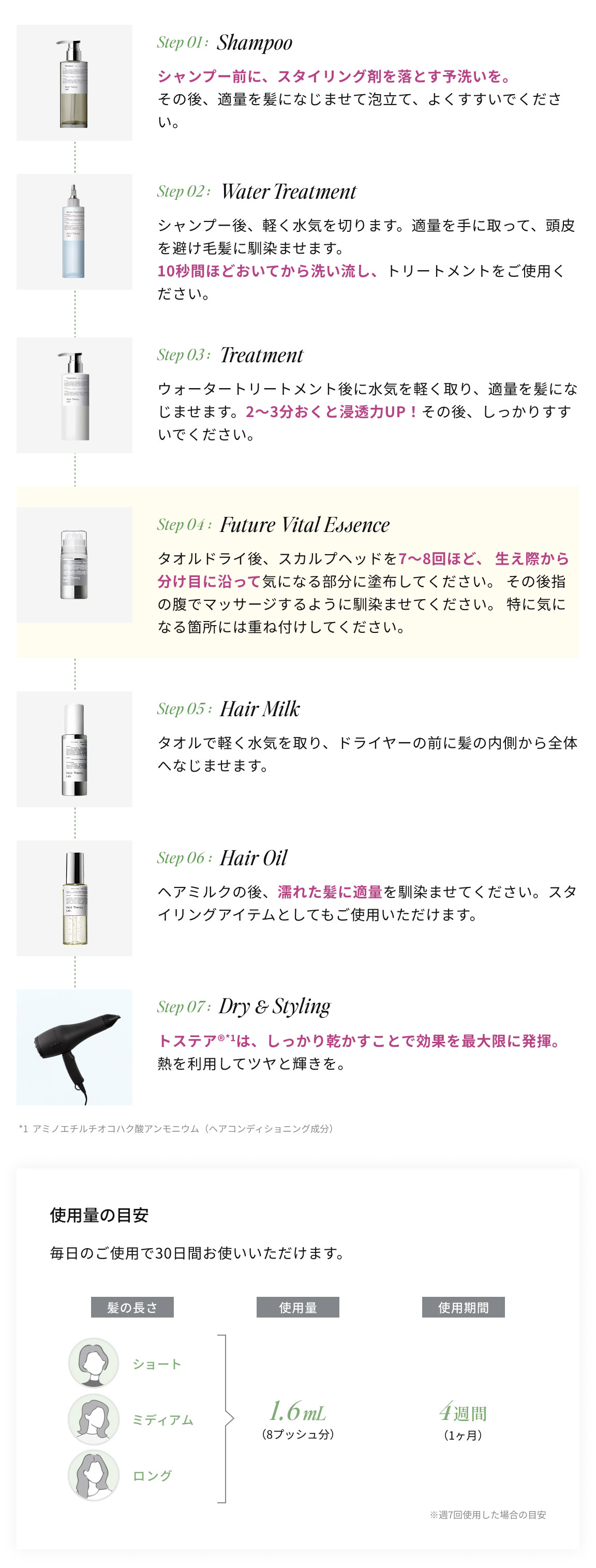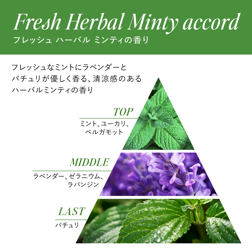 水、イソペンチルジオール、ペンチレングリコール、BG、イノシトール、PEG-40水添ヒマシ油、シクロヘキサン−1,4−ジカルボン酸ビスエトキシジグリコール、フェノキシエタノール、グリセリン、パンテノール、香料、カルボマー、メントール、グリチルリチン酸2K、水酸化K、センブリエキス、リヌムアルピヌム花/葉/茎エキス、マンダリンオレンジ果皮エキス、エンドウ芽エキス、安息香酸Na、ジフェンヒドラミンHCl、ゴボウ根エキス、クエン酸、エタノール、ヒト毛根幹細胞順化培養液、プロパンジオール、クロレラエメルソニエキス、1,2-ヘキサンジオール、レシチン、トウガラシ果実エキス、デキストラン、スピルリナマキシマエキス、アスコルビン酸、アセチルテトラペプチド-3、アカツメクサ花エキス、トコフェロール
